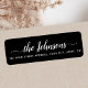 Elegante schwarze Rücksendeadressen-Aufkleber mit Ihrem Namen in einem niedlichen Kalligraphie-Skript-Schriftart mit der unten angegebenen Adresse. Mit dem Anpassungstool können Sie Hintergrund- und Schriftart-Farben in beliebiger Farbe ändern.
