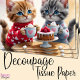Zwirnpapier, ideal für Geschenkverpackungen oder Entcouponierung mit einer Illustration von zwei niedlichen und bezaubernden Kätzchen, die heißes Kakao mit Marshmallows trinken und Himbeerkuchen essen. Die blauen mit Augen Kätzchen tragen Pullover, die mit Herzen dekoriert sind.