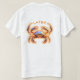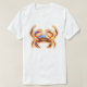 Eine lebendige, fast schon rieszierende Krabbe steht vor einem schlichten sandfarbenen Hintergrund, dessen Krallen aufgewachsen und bereit sind. Die Muschel und Gliedmaßen der Kreatur leuchten mit einem Farbspektrum, das ein Gefühl von Leben und Bewegung vermittelt.