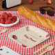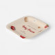 Teller mit niedlichen Lovebug-, Kuchen-, Blume- und Erdbeerabbildungen in rot, weiß und hellbraun. Zusammen mit den Illustrationen sind ein spielerischer Skript-Schriftart und eine elegante Sans Serif, in dem alles, was Sie personalisierte Informationen geschrieben werden. Karo in unserem Shop für weitere Artikel aus dieser Kollektion.
