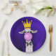 Papier Teller mit einem whimsical Lama, die während des Kaugummis eine rosa Blase blasen. Tragen einer Goldkrone und einer schwarzen Bogen-Krawatte. Dunkler lila abstrakter Hintergrund.