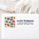 Adressetikett mit einem niedlichen Makaronmuster in vielen verschiedenen Farben mit einem schwachen Polka Punktmuster dahinter.