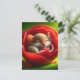 Eine niedliche, flauschige Maus, die friedlich in einer lebendigen, roten Mohnblume-Blume schläft. Die Blütenblätter der Blume sind weich und detailliert und umgeben die Maus wie ein gemütliches Bett. Der Hintergrund ist in sanften grünen Farbtönen gehalten und schafft eine ruhige und ruhige Atmosphäre. Ein helles Licht verleiht dem Raum eine magische Touch.