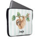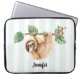 Die Laptop-Hülle mit einem zauberhaften Faultier, der von einem Baumzweig auf den Kopf hängt. Der Baumzweig ist mit tropischen Blätter und Beeren dekoriert. Set auf einem hellgrün-weiß gestreiften Hintergrund.