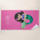 Niedliches personalisiertes Mädchenlatino-Imitat-Folien-Meerjungfrau-Badetuch. Entzückende kleine Meerjungfrau mit Imitat vereiteln grünen Schwanz, lila Behälterspitze und die lila und rosa Starfish in ihrem dunklen schwarzen Haar. Personifizieren Sie mit Namen im Weiß auf einem hübschen hellen rosa Hintergrund. Fertigen Sie zur Änderungshintergrundfarbe oder -Schriftart besonders an. www.SamAnnDesigns.com