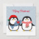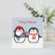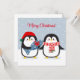 Zwei niedliche Pinguine und ein fisch geformtes Geschenk-Paket. Sag "Frohe Weihnachten!" mit dieser schönen Grußkarte.