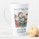 Erleben Sie die Urlaubsstimmung in dieser festlichen Latte-Tasse, die ein von der KI generiertes Bild norwegischer Eisbären zeigt, die in festlichen Schals, Schaukeln, Hosen und Schuhen gekleidet sind, mit dekorativen Touchs heiliger Blätter und Beeren, und in ihren Liederbüchern "Sweet 'n' Tasty Tidings and a Very Beary Christmas!" kochen. Passen Sie das Messaging auf Wunsch an. Umkehrung zeigt identisches Design. Design © W.H. Sim. Weitere Informationen unter zazzle.com/word2art