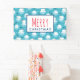 Ein Banner, der frohe Weihnachten sagt - mit einem niedlichen Weihnachtsmuster mit Eisbären, die auf schwimmendem Eis mit roten Weihnachtsmannmützen stehend sind. Kleine Iglus, Schneeflocken und Fische umgeben diese bezaubernden Eisbären, die auf dem Wasser abkühlen. Hellblauer Hintergrund. Niedliche und skurrile Urlaubsplanung.