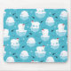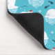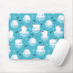 Mousepad mit niedlichem Weihnachtsmuster mit Eisbären, die auf schwimmendem Eis mit roten Weihnachtsmannmützen stehend sind. Kleine Iglus, Schneeflocken und Fische umgeben diese bezaubernden Eisbären, die auf dem Wasser abkühlen. Hellblauer Hintergrund. Niedliche und skurrile Urlaubsplanung.