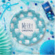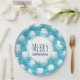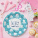 Papier Teller mit einem niedlichen Weihnachtsmuster mit Eisbären, die auf schwimmendem Eis mit roten Weihnachtsmannmützen stehend sind. Kleine Iglus, Schneeflocken und Fische umgeben diese bezaubernden Eisbären, die auf dem Wasser abkühlen. Hellblauer Hintergrund. Niedliche und skurrile Urlaubsplanung. Frohe Weihnachten in einem weißen Kreis geschrieben.