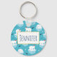 Ein Schlüsselanhänger mit einem niedlichen Weihnachtsmuster mit Eisbären, die auf schwimmendem Eis mit roten Weihnachtsmannmützen stehend sind. Kleine Iglus, Schneeflocken und Fische umgeben diese bezaubernden Eisbären, die auf dem Wasser abkühlen. Hellblauer Hintergrund. Niedliche und skurrile Urlaubsplanung. Ein Rechteck mit einem Imitat mit Goldfolie umschließt Ihren Namen.
