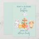 Diese niedliche Ostergrusskarte ist ein Christliches religiöses Motiv in einem pastellfarbenen Aquarellbild. In der Mitte wird ein Holzkreuz abgebildet. Kleintiere, wie Lamm, Küken und Hasen, werden rund um das Kreuz abgebildet. Frühlingsblumen und Ostereier betonen das Bild.