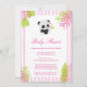 Diese niedliche Babyduscheneinladung ist ein Pandathema, das für ein kleines Mädchen perfekt ist! Sie kennzeichnet tropisches Blätter des Rosas und des Grüns an jeder Ecke mit einem Watercolorstreifenhintergrund. An der Spitze gibt es einen niedlichen Mädchenpanda nahe bei den rosa und grünen Herzen.