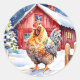 Niedliche Weihnachtsaufkleber zum Thema Farm. Rote rustikale Scheune und ein Huhn stehend auf einem roten Zaun.