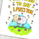 Der Hintergrund dieser Karte ist weiß. Von oben nach unten steht geschrieben " Hier ist eine kleine Karte für Sie zu sagen, ich vermisse Sie". Die Buchstaben sind handgezeichnet, gelb und orange. Die Worte sind gerahmt mit kleinen rosa und violetten Blumen. Unter ihnen ist der zeichn eines niedlichen kleinen Schafes, gezeichnet in einem Cartoon Stil. Es hat eine rosa Blume im Mund und lächelt den Betrachter an. Es ist stehend in einem grünen Grasfeld mit kleinen rosa Blume. Hinter den Schafen ist ein blauer Himmel sichtbar.
