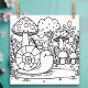 Eine Schnecke, die von niedlichen Pilzen in einem Hütte-Core-Farbposter knistert. Niedliches Erwachsenenfarbposter für Kinder, Jugendliche oder Erwachsene, einfache, dicke Linien, um die Färbung zu erleichtern.