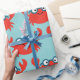Ein glückliches, maßgeschneidertes Krabbenmaskottchen mit großen Augen. Er posiert mit seinen großen Krallen in der Luft, ist aber sehr freundlich und niedlich. Er trägt gerne eine große, stilvolle Brille, weil dies ihm einen einzigartigen Look und Stil verleiht, sodass er ein moderner Hipster Krustentier sein könnte.