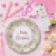 Papier-Teller mit einem niedlichen nordischen Muster. Winterkiefern, Bären, Rentiere und Eichhörnchen. Hellbraune Farbe. Ein weißer Kreis überlagerte sich oben mit frohen Weihnachten, die innen geschrieben wurden.