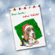 Auf dieser niedlichen Holiday Grußkarte ist ein Aquarellbild eines bezaubernden Beagle, der in Weihnachtsbaumleuchten eingewickelt ist. Der Jungtier trägt eine rot-weiße Weihnachtsmannmütze. Das Bild wird auf einem hellen grüne Weihnachtsfleck platziert, und der Text in grün und rot oben sagt "Lieber Weihnachten...Definiert "Gut". Die Innenseite hat ein anderes Bild der Welpe, mit benutzerdefinierten Textfeldern für Sie personalisieren.