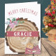 Personalisierte Weihnachtskarte mit rustikalem Holz und niedlichen Katzen. Die Vorlage ist Set für Sie, um einen Namen auf der Kartenvorderseite hinzuzufügen und Sie können auch die Nachricht im Inneren bearbeiten. Die Formulierung auf der Vorderseite lautet einfach "Frohe Weihnachten [Name]" auf einem Banner über eine Holzbaumscheibe. Das Design ist mit zwei niedlichen Kätzchen in roten Weihnachtspulli mit einem Bouquet Weihnachtslieder-Blume dekoriert.