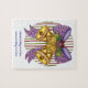 Leicht zu anpassen Puzzle, fügen Sie Ihre eigene spezielle Urlaubsbotschaft! Vintage Illustration Frohe Weihnachtsfeiergestaltung mit goldenen Glocken aus Cartoon, die mit einem großen Band in einem schönen Bogen verbunden sind, und heiligen Beeren über einem ovalen gestreiften Muster.