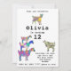 Eine Kollektion von bunten, psychedelischen Ziegen in lebhaftem Rosa, lila, blau, orange, gelb und aqua mit Saugziege, Babyziege und Ziegen, die auf Ziegen stehend sind. Eine niedliche bunte Farm Tier Geburtstagsfeier. Diese lustige Party Einladung von Nutztieren ist leicht zu personalisieren, um eine einzigartige Party Einladung für Kinder und erwachsene Ziegenliebhaber zu schaffen. Original-Kunstwerk von Catherine Sweetman