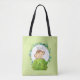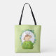 Eine Tasche mit einer Illustration eines kleinen Affen, der hinter einem grünen Busch Sprichwort herausschaut, hallo. Umgeben von einem Kranz tropischer Blätter. Set auf einem olivgrünem Aquarell. Der "Hello"-Text kann mit einem Namen oder einem anderen Text personalisiert oder wie verlassen werden.