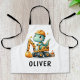 Mit dieser personalisierten Schürze bereiten Sie sich auf dinogroßen Spaß in der Küche vor! Ein charmantes Aquarelldesign mit einem spielerischen Dinosaurier, der einen hellgelben Bagger betreibt. Fügen Sie den Namen Ihres kleinen Koch für ein einzigartiges und chaotisches Erscheinungsbild hinzu. Ideal für Dino-Fans, die sich die Liebe geben, kulinarische Meisterwerke zu kreieren!