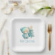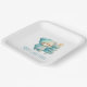 Papier Teller mit einer schönen Abbildung. Ein gemütlicher Bär mit Sternen und Glitzern in seinem Fell. Stehend neben einem Weihnachtsbaum. Pastellblau-grün. Whimsical und niedlich.