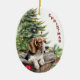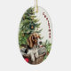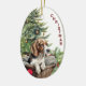 An der Vorderseite dieses Holiday-Ornaments befindet sich das Bild eines hübschen kleinen Beagle-Hundes, der in seinem Korbbett aus Korbweide vor einem verzierten Weihnachtsbaum liegt. Kurzer roter Text an der Seite sagt "CHRISTMAS". Auf der Rückseite steht rot und grün "MERRY CHRISTMAS", und es gibt zusätzliche Textfelder, die Sie nach Ihren Wünschen anpassen können.