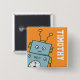 Niedliches Roboterquadrat-Button-Abzeichen, das mit einem Namen Ihrer Wahl personalisiert sein kann. Diese hellen und vibrierenden Ausrüstungsbeschreibungen ein glücklicher blauer und grüner Roboter auf einem orange Hintergrund mit weißem Schreiben. Copyright © Lisa Marie Robinson. Alle Rechte vorbehalten.