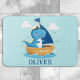 Personalisiertes Segelboot Captain Dino - eine charmante Badematte, wo ein niedlicher blauer Dinosaurier ein reizvolles kleines Segelbootabenteuer erleben kann. Mit diesem nautisch-thematischen Design lassen Sie die Fantasie Ihres Kindes wecken.