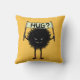 Umarmtes Kissen mit einem niedlichen bösen Monster - grinsender haariger Charakter aus der Familie des Bösen Blume Bug. Es enthält ein Schild mit der handgeschriebenen Welt "Umarmen?". Dieses freundliche, komische Geschöpf hat hübsche, kleine, totfreie Socken, nur um sich in dieser unfreundlichen Welt die Füße warm behalten.