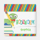Dieser Quadratmagnet kennzeichnet einen Bücherwurm, der einen Bleistift hält und auf einem Stapel Büchern sitzt. Der Hintergrund ist ein buntes diagonales Streifenmuster mit einem weißen Kasten in der Mitte mit dem bunten Wort: Bücherwurm. Kundengerechter Text erlaubt Ihnen, einen persönlichen Namen zu addieren.