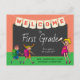 Begrüßen Sie Ihre Schüler mit dieser skurrilen Postkarte wieder zur Schule. Das Design zeigt niedliche Cartoon-Illustrationen von Kindern mit Rucksäcken und eine Lehrerin, die auf einer Tafel schreibt und ihre Schüler zur ersten Klasse einlädt. Personalisieren Sie mit dem Namen und der Schule des Lehrers.