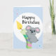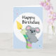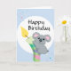 Ein Kind-freundlicher niedlicher chubby Cartoon Koala, der eine Kerzenillustrationsgeburtstags-Grußkarte, mit Fliegen Confetti im Hintergrund erfasst. Kann auf 1. Geburtstag verwendet werden.