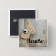 Personalisierter Knopf mit einem lieblichen Foto eines niedlichen gestopften Bären, stehend von einer rustikalen Holzwand / Kulisse.