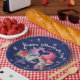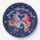 Auf diesen niedlichen Valentinstag Papier Tellern tragen zwei bezaubernde kleine Gnome lila und rosa Hüte. Einer hält einen Strauß Blume hinter seinem Rücken, der andere ein rosa Herz. Der weiße Text darüber sagt "Happy Valentine's Day". Die Bilder und Texte werden auf einem marineblauen Hintergrund mit sanften rosa schwebenden Herzen platziert.