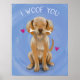 Niedliche, handgemalte Abbildung eines goldenen Retriever mit einem Knochen im Mund mit einem Text darüber, der "ich wöde dich" sagt.