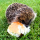 Ein niedlicher kleiner Igel, der eine recht große Mahlzeit genießt!