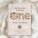 Feiern Sie Ihren ersten Geburtstag mit dieser bezaubernden Bären-Einladung. Mit einem handgezeichnet Teddybärengesicht, gemütlichen Brauntönen und spielerischer "ONE"-Schrift ist dieses Design perfekt für ein neutrales, waldliches oder rustikales Party. Personalisieren Sie Ihre Daten mit Name, Datum und Party Ihres Kindes. Eine süße und zeitlose Wahl für Jungen, Mädchen oder geschlechtsneutrale Feiern.
