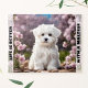Puzzle zum Frühjahrsthema mit einem bezaubernden Wasserfarbenpuppenthund maltesischen Hund in rosa Blume. Ein niedliches personalisiertes kleine Geschenk oder Geburtstagsgeschenk für Kinder und alle Hundefreunde. Es ist mit einem Karton-Handkoffer mit Puzzle-Bild auf Deckel aufgedruckt! Personalisieren Sie den Text einfach oder verließ ihn leer. Kate Eden Art