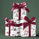 Niedliche nordische Weihnachtshäuser Igel Floral Wrapping Paper enthält 3 verschiedene Muster Häuser, Igel und Winter Blumen in grau und rot auf einem weißen Hintergrund. Von Evco Studio entworfen www.zazzle.com/store/evcostudio
