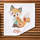 Dieses personalisierte Kinderwaschtuch zeichnet sich durch einen niedlichen, skurrilen Fuchs aus, der in einem Patchwork-Stil gestaltet wurde. Der Fuchs ist mit einer Mischung aus farbigen, gemusterten Stoffen, wie Polka-Punkte, Streifen und grünen Texturen gestaltet.