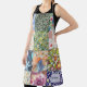 Eine niedliche gürtelblumengeschmückte Schürze, die wie ein Quiltpflaster aussieht, mit Blume-Quadraten aus Stoff, Imitaten Stiches und einem personalisierten mit ihrem Namen.
