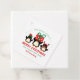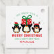 Drei niedliche und festliche Weihnachtspinguine bringen Feiertagsstimmung in Ihre Geschenkverpackung und -umschläge. Der mittlere Pinguin hält ein Geschenk über seinem Kopf. Der Pinguin auf dem links hat einen roten und grünen Elfenhut und der rechts hat einen Rentierhut. Wir wünschen Ihnen frohe Weihnachten und ein glückliches neues Jahr ist in rot und grün Schriftart geschrieben. Ihr Name vervollständigt das Design.
