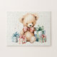Ein Rätsel mit einer niedlichen Abbildung mit einem Viktorianischen Teddybär. Tragen eines extravaganten roten Bogens. Gezeichnet in einem niedlichen altmodischen Vintagen Stil. Rote und blaue Pastellgeschenke umgeben diesen herzhaften Bären.