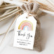 Moderne Geschenktags mit Regenbogen-Geburtstagsgeschenk mit einem Aquarellregenbogen in Gelb-, Rosa-, Korallenrot und Blau in den Farbtönen "Danke", die unten in einem handgeschriebenen schwarzen Skript angezeigt werden. Personalisieren Sie die Regenbogengeschenketiketten, indem Sie den Namen und das Alter des Geburtstags oder Jungen hinzufügen. Die Rückseite des Geschenktafels weist ein passendes Regenbogenmuster auf. Die Geschenketiketten sind perfekt für Geburtstagsfeiern, Babyduschen und andere Events!