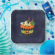 Papier Teller mit einem Halloween Kuchen mit einem großen Augapfel und anderen verschiedenen spukhaften Elementen.