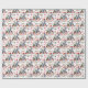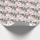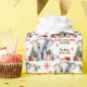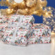 Das wiederholte Muster auf diesem Weihnachtsverpackungspapier ist ein niedlicher grauer Elefant, der eine rot-weiße Weihnachtsmannmütze trägt. Der Elefant steht inmitten von Kiefern und lebhaft eingewickelten Weihnachtsgeschenken. Roter und grüner Text sagt MERRY CHRISTMAS", mit dem Namen Ihres Kindes und Ihrer Unterschrift unten. Weitere Bilder im Muster sind u.a. rote dekorative Schneeflocken und Bonbons.